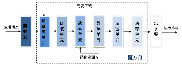 魔方舟泥膜耦合脱氮除磷一体化污水处理设备采用泥膜耦合A3O工艺,具有故障点少、工艺稳定性高,多点精准气提控制、低能耗,出水水质稳定,可无人值守的特点。