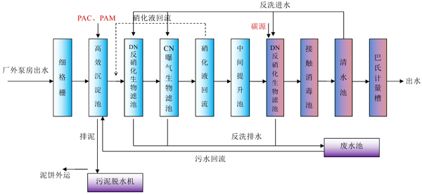 马鞍山城镇南部污水处理厂规划设计总规模9.5万吨/天,现状规模只能处理4.5万吨/天。根据现状进水水量监测,其水量已超过目前污水处理厂处理量的20%,须对马鞍山城镇南部污水处理厂扩建,扩建处理规模5万吨/天污水处理厂一座。本工程采用先进的“高效沉淀池+中置硝化三级生物滤池”的组合工艺,再经过末端处理出水达到“准Ⅳ类标准”后排放至朝阳沟。本工程脱水后污泥(80%)运至指定地点进行处置。